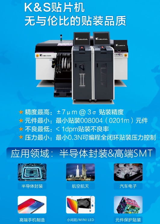 K&S的Hybrid係列午夜在线小视频,對PoP堆疊裝配的技術和工藝進行了進行了友好的支持與優化。最小0.3N的可編程全閉環貼裝壓力控製,±7μm@3σ的貼裝精度,以及<1dpm的貼裝不良率,為高直通率提高有力的保障。