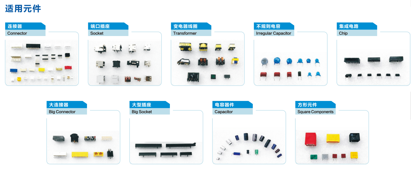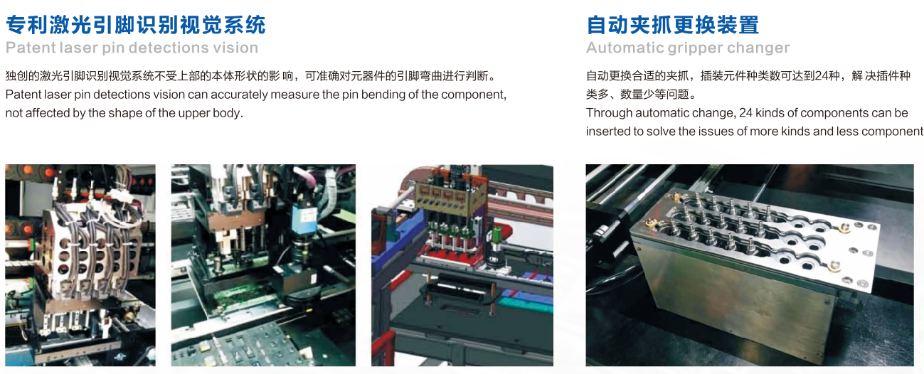 B&P異型元件插件機,自動更換合適的夾抓,插裝元件種類可達到24種,解決插件種類多、數量少問題。